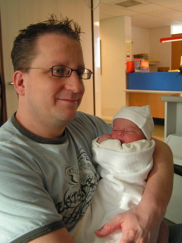 Vandaag heb ik mijn zoon aangegeven bij het gemeentehuis in Hilversum. Toch ook wel een heel leuk moment. Hij is keurig bijgeschreven in ons trouwboekje, en ik heb een kopie van het geboortebewijs gevraagd, wat je normaal niet meekrijgt, schijnt. Nadat Jesse gisteren voor het eerst borstvoeding heeft geproefd, krijgt hij de smaak te pakken en weet al aardig aan de "tiet" te lurken. Helaas is de borstvoeding nog niet helemaal op gang gekomen, en kan meneer lurken wat hij wil, maar komt er (bijna) niets uit, wordt dan ongeduldig en zet even zijn keel op om dit te laten weten. De afgekolfte voeding houdt hij goed binnen, zijn temp is goed. Ook is hij nu van de bewaking af en krijgt hij dus alleen nog uit voorzorg anti-biotica. Eigenlijk lijkt er niet veel aan de hand dus, maar ja toch nog even de bloed onderzoekjes afwachten... Met Brenda gaat het ook een stuk beter. Vandaag voor het eerst alleen gedouched en het lopen gaat steeds beter. Toch aan het eind van de avond zo vermoeid dat ze geen borstvoeding kon geven. Maar onze vent vindt het maar wat makkelijk dat eten door zo'n slangetje, dus het zal hem een zorg zijn. Vandaag waren de geboortkaartjes om half zes pas klaar, die ga ik morgen halen, dus mensen van het weekend ligt ie in de bus... Verder heeft Jesse vandaag kennis gemaakt met: Tante Ciska, Ome Hans, tante Laura, Oudoom Richard Oudtante Anita, Marga en Bernadette, Nichtje Chantal en Joelle maar waren ook "oude" bekenden als Oma Trees, Oma Irene en Opa Bert aanwezig.
