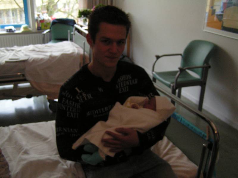 Na zo'n hectische nacht/dag als gisteren is het eerst bijkomen.. Wel ongelooflijk trots en blij gevoel natuurlijk. Brenda heeft veel last van de wond in haar buik van de keizersnee. Maar ja eigenwijs als ze is wil ze toch 's middags al in een rolstoel naar Jesse toe voor de borstvoeding. Dit viel haar wel tegen, maar zal ze natuurlijk niet toegeven. Daarom had ik de verpleegster maar ingefluisterd op de gang dat ze 's middags met haar bed naar Jesse moest omdat ze toch veel last had.. Haha gemeen he ;) Jesse was zijn eerste ochtend wel misselijk en hield weinig voeding binnen. Nadat 's middags zijn maagje werd leegepomt bleek er nog wat vruchtwater in zijn maag te zitten. Sinds dit er uit is en hij wat afgekolfte moedermelk heeft gekregen gaat het ineens een heeeeeel stuk beter. Spuugt nu niet meer dan een normale baby. Hij krijgt in ieder geval wel tot zeker donderdag anti-biotica, dus tot die tijd zal hij nog niet op de kamer bij Brenda zijn.. helaas. Ook vandaag voor het eerst twee luiers verschoond, en hij had (gelukkig) gelijk de hoofdprijs voor me.. Lekker volgescheten, heeft ie in ieder geval iets van zijn vader... Ook was vanmorgen de domeinnaam www.jessejan.nl officieel geregistreerd. Nog geen dag oud en al een eigen website haha...Vandaag zijn Oma Irene, Opa Bert, Oma Trees, Ome Jonny, Michel, Sander en Tane Sil op visite geweest. Ome Jonny en Michel hadden vandaag hun rijbewijs opgehaald en zijn in hun BMW's naar het ziekenhuis gereden. Ik heb geen ambulances gehoord dus er zijn geen gewonden gevallen in Hilversum denk ik :)