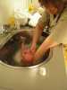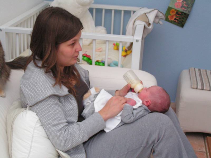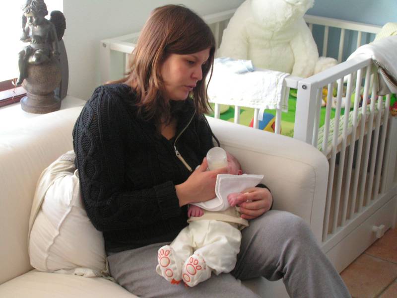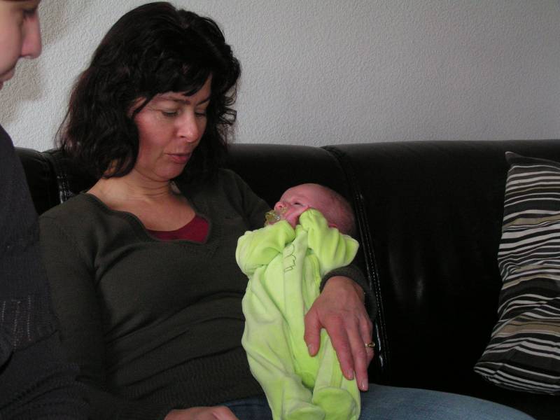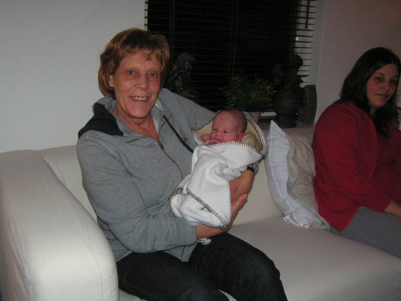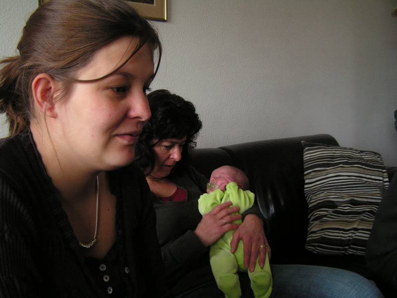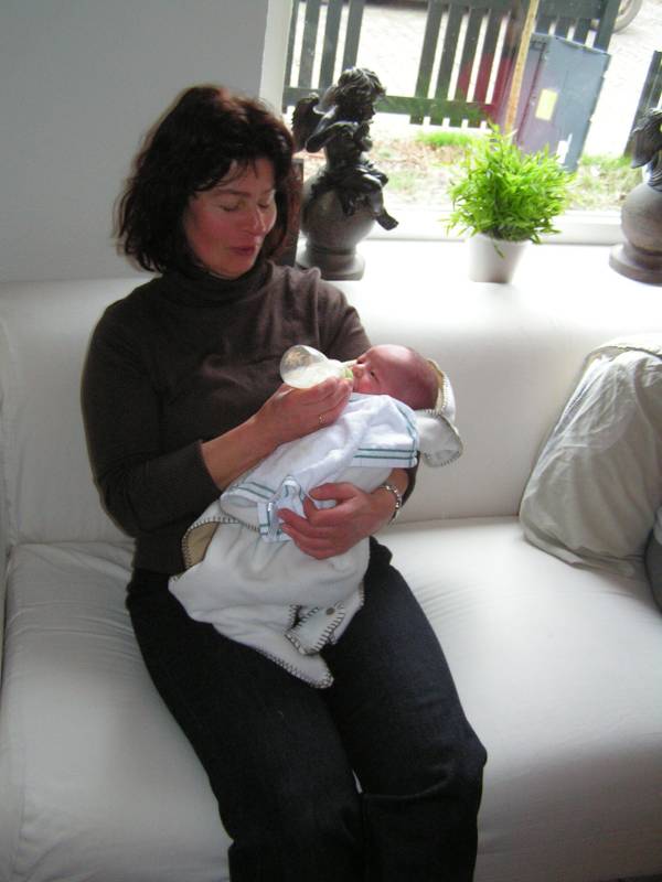 Vandaag was de eerste dag zonder kraamzorg, dus eerst lekker uitgeslapen !! Daarna heeft Brenda eerst Jesse lekker in bad gedaan. Dit kon ze in ieder geval goed volhouden, ondanks dat ze nog snel last heeft van de keizersnee als ze lang staat. Daarna is Jesse gaan slapen en papa boodschappen gaan doen... Geluk zit in kleine dingen. Zo was ik ook vandaag weer een gelukkig man toen ik eindelijk na drie jaar wachten de C1000 in ging en bij de kassa een pak luiers op de band kon leggen :) Nu mag ik ook op de "babyafdeling" in de C1000 komen. Eenmaal thuis gekomen kwam er een hele oude dame bij Jesse op bezoek, wel 4680 keer ouder dan ons kleine knulletje. Brenda werkt bij deze oude dame van bijna 90. Zij was speciaal voor Jesse gekomen in haar scootmobiel en had een mooi kinderbestekje gehaald bij de juwelier in Baarn. Zij was vanaf het begin van onze IVF pogingen op de hoogte en leefde erg met ons mee, erg lief. Zij is vroeger verloskundige geweest en keek er altijd erg naar uit als er weer een echo was gemaakt van Jesse; "want dat hadden ze zestig jaar geleden niet". Daarna heerlijk gerelaxed en 's avonds kwamen Opa Bert en Oma Irene nog even op bezoek. Die moesten natuurlijk ook even op de foto met Jesse. Moeders mocht nog even voor melkkoe spelen en ging daarna naar bed, waarna papa niet lang op zich zal laten wachten.........