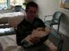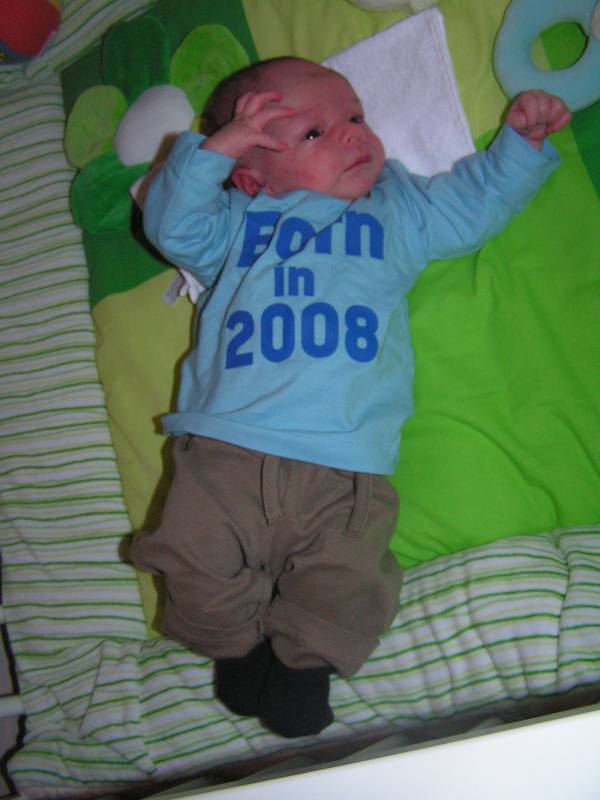 Vandaag hebben we niet veel gedaan, lekker de dagelijkse dingen, Jesse in bad en zo. Ik heb Jesse wel aangestoken met mijn verkoudheid. Dus het arme ventje heeft af en toe al een snottebel aan zijn neus hangen. Vandaag een neuspompje gehaald, zodat we in ieder geval zijn neus vrij kunnen maken van de snotjes... Vandaag is Rene op visite geweest. De rij-instructeur van Brenda, en ooit ook die van mij. Het heeft zolang geduurd voor ik mijn rijbewijs had, dat we een nauwe band hebben opgebouwd. (haha 78 lessen !!!) Jesse ligt nu heerlijk tevreden in zijn box te slapen, tot hij weer wakker wordt voor zijn volgende voeding. Hij had vandaag zijn stoere trui "born in 2008" aan, die we afgelopen zaterdag hebben gekocht in Utrecht.... Brenda is goed aan het herstellen en ik ben natuurlijk nog steeds supertrots op Bren en Jesse !!! Een superlieve vrouw en zoon !!