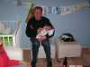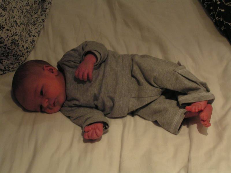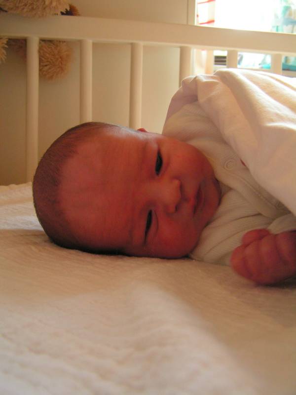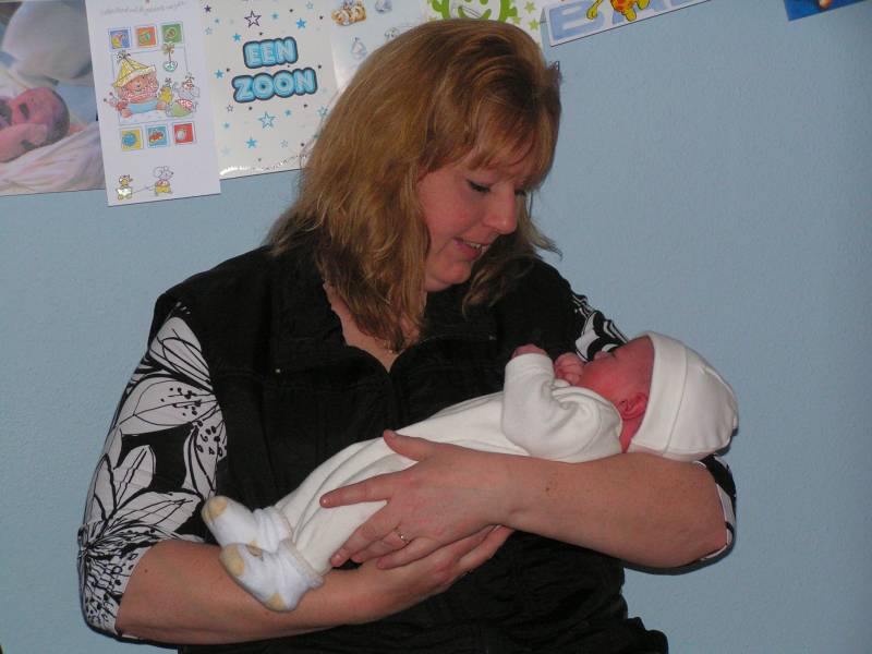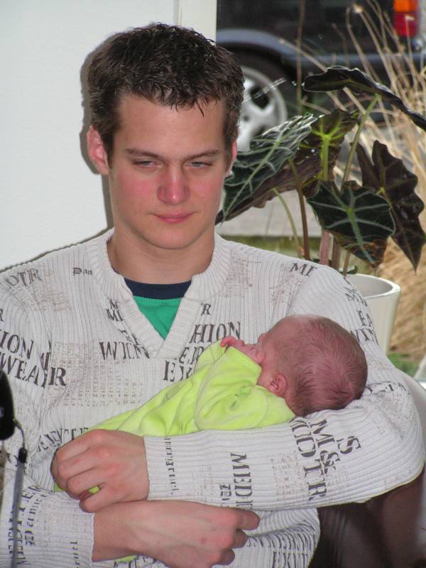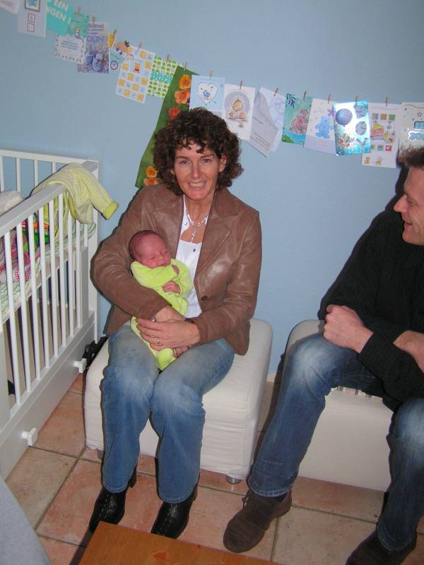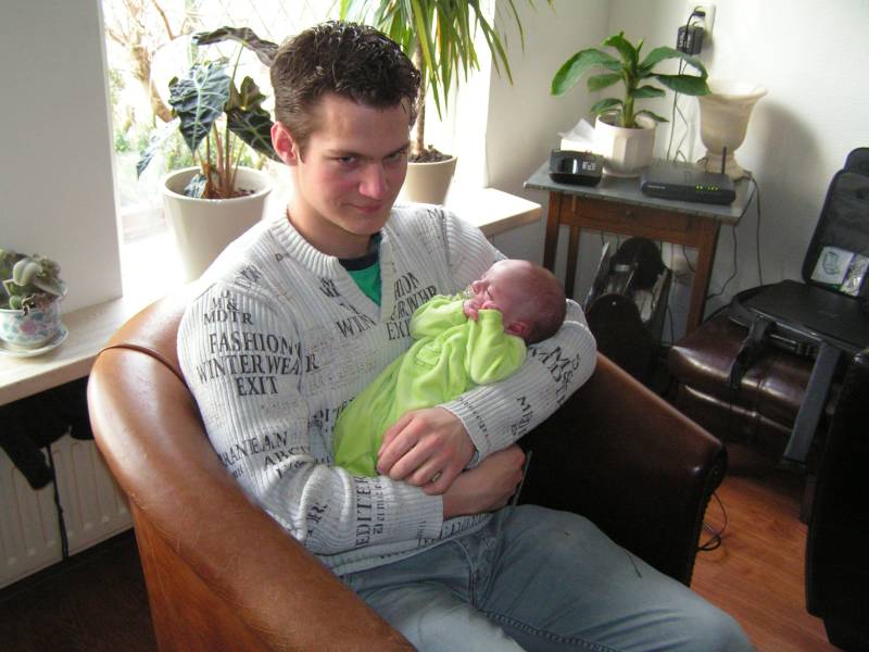 Hallo allemaal !! Mijn papa is erg lui vandaag, hij heeft de halve dag in zijn bed gelegen. Zal dat komen omdat ik tot vijf uur vanmorgen heb zitten klieren ?? Er stond toch niet voor niets op het geboortekaartje: "Maar nu ik ben geboren, kan ik ook mijn papa storen" ? Daarom neem ik het vandaag maar even van hem over. Vanmorgen kwam voor het laatst de kraamzorg even bij mij kijken. Zij was er vandaag voor het laatst, dus de volgende keer dat wij haar zien is als papa en mama bezig zijn met een broertje of zusje voor mij. Maar dat mag wel even wachten hoor, nu heb ik lekker alle aandacht (en kado's) voor mijzelf. Ik ben ook door haar gewogen, en ben nu 3200 gram, dus 250 gram aangekomen sinds ik uit het ziekenhuis ben. Daarna kwam er iemand van het consultatieburo of zoiets en die kwam naar mijn oren kijken, een gehoortest. En hiervoor ben ik geslaagd, dus ik kan goed horen ! Of ik ook goed zal luisteren is natuurlijk een ander verhaal. De buurvrouw kwam nog even kijken bij mij en nam een paar mooie schoenen voor me mee. Nu vindt ze me nog lief, maar dat zal wel minder worden als ik over een paar jaar mijn voetballen haar tuin in trap, en alle plantjes plat worden.... Daarna is mijn papa gaan slapen dus en heb ik mama lekker bezig gehouden de rest van de dag... Ome Wim kwam nog even kijken en bracht allemaal speeltjes mee voor in de box, en aan het eind van de middag Ome Bob, met mooie kleertjes voor mij, als ik wat groter ben. Toen ben ik gaan slapen en dat heb ik bijna 6 uur lang volgehouden ! Terwijl ik sliep kwamen ome Rein en tante Lies bij mij kijken. Tante Lies wilde mij graag vasthouden, maar papa en mama hebben mij lekker laten slapen. Helaas lieten ze me slapen, want ook ome Sander en tante Sil kwamen langs met een groot kado voor mij: een hele stoere kinderfiets van Giant met zijwielen, een fietsbel en een Kawasaki vlag zodat iedereen mij straks ziet fietsen !! Hiermee maak ik de blits natuurlijk in de wijk... Vallen de meiden als bosjes voor me.... Dat was de dag dan weer voor vandaag, nou maar eens kijken of ik papa een nachtrust gun vannacht, zodat hij in ieder geval wat meer (en betere) foto's gaat maken. Maar dat zien jullie morgen wel dan,