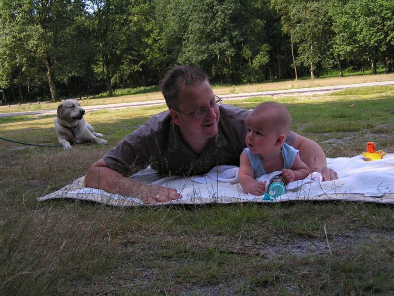 Woensdag was paparazzi een dagje vrij en moeders niet. Dus gezellig de hele dag met mijn zoon geweest. Het was superlekker weer dus om 9 uur 's morgens waren we met Yco in het bos. De Kuil in Lage Vuursche. Daar eerst een uur door het bos gelopen. Natuurlijk moesten er weer een paar kiekjes genomen worden. Ook Yco vond een lekkere poel vol met kikkers. Eén sprong en hij lag er tussen. Eenmaal terug op de dagcamping ging er een kleedje op het gras en hebben Jesse en ik lekker gepicknickt. Na een uur huiswaarts gegaan omdat het al erg warm werd, en de rest van de dag in de tuin vertoefd... Donderdag had ik late dienst en bleef Brenda met Jesse bij ome Rein en tante Lies eten. Vaders heeft ze daar later weer opgehaald. Vrijdag heeft tante Lau de hele dag opgepast. Dat was natuurlijk weer leuk en papa en mama bleven nog eten ook !! Gesmikkeld en daarna op tijd naar huis, want Jesse was wel een beetje moe na zo'n leuke dag. Zaterdagavond kwamen ome Rein en tante Lies even langs... Weer leuke muziek opgezet en Jesse werd natuurlijk volop geknuffeld. Maar Jesse verheugde zich vooral op de volgende dag, want toen kwamen opa en oma Kip weer thuis. Die had Jesse al vier weken niet gezien, dus hij was erg blij ! En ook opa en oma vonden het erg fijn om Jesse weer vast te houden. Dus weer bijgepraat en gelukkig mogen opa en oma woensdag de hele dag oppassen.......... Vanavond was ik chili con carne aan het maken, maar dat was zoveel, dat ik ome Rein en tante Lies maar heb gevraagd te blijven eten. Die stonden snel voor de deur. Bijna alles opgegeten, dus daar hadden ze de volgende dag ook wel weer schik van :) Toen ze weggingen was Jesse allang in dromenland en zijn vader en moeder deden ook snel daarna het licht uit................