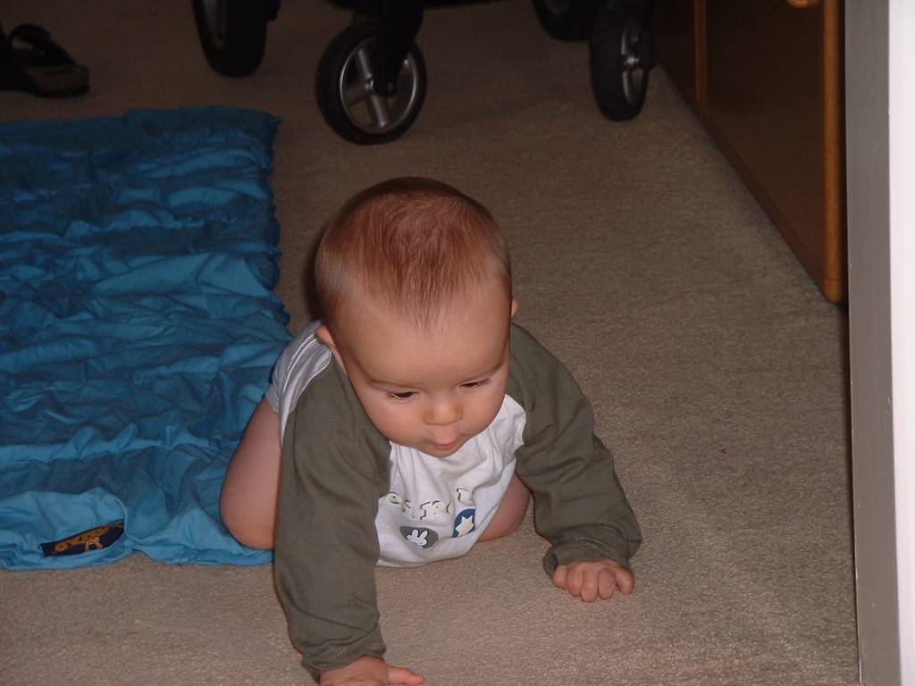 Jesse wordt al een grote vent... Het kruipen komt al goed op gang en hij trekt zichzelf al op aan de box en zijn bedje tot hij staat... Stilzitten kon hij al niet, maar nu helemaal niet meer... Bij deze akties stoot hij natuurlijk wel regelmatig zijn hoofd, maar dat hoort er nou eenmaal bij. Hij is wel een bikkel want huilen hoeft hij dan bijna nooit. De bodem van de box en bedje hebben we nu wel naar beneden gedaan. Opa en oma Kip hebben tijdens het oppassen woensdag weer leuke foto's gemaakt bij de Wilhelmina vijver. Vrijdag was vaders vrij, dus hadden we gezellig een "papadag".. Lekker knuffelen en spelen met mijn zoontje... Zondag was het superslecht weer, maar gelukkig speelde tante Liesje voor taxi, want we hebben daar lekker gegeten en gespeeld op het kleed in de woonkamer. Dat vond Jesse super! Natuurlijk was op het kleed blijven niet zo leuk, dus vooral proberen eraf te kruipen. Onze vrienden van Farao hebben we ingeruild voor Sophie (Grieks/snackbar), en nog een paar maanden en kan Jesse ook zijn eerste girosje met knoflooksaus naar binnen werken... Vandaag werd Jesse weer op het consultatieburo verwacht. Hij weegt nu 8.490 gram en is nu 67 centimeter lang. Ook werd er verteld dat hij in zijn ontwikkeling voorliep voor zijn leeftijd. En dat vinden papa en mama natuurlijk leuk om te horen.... Jesse is gewoon een pienter kereltje :) :)