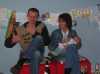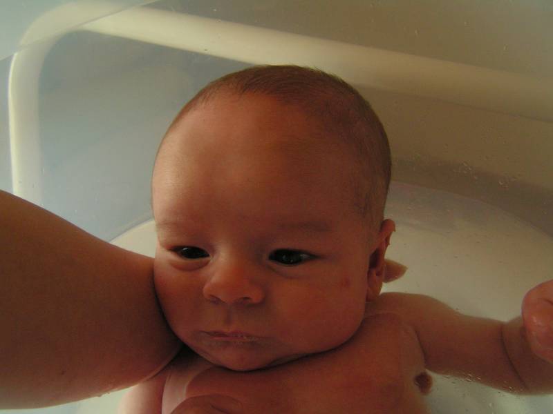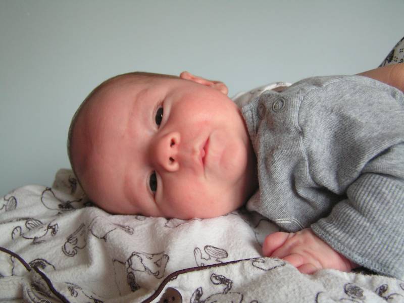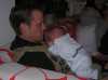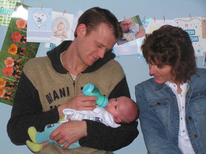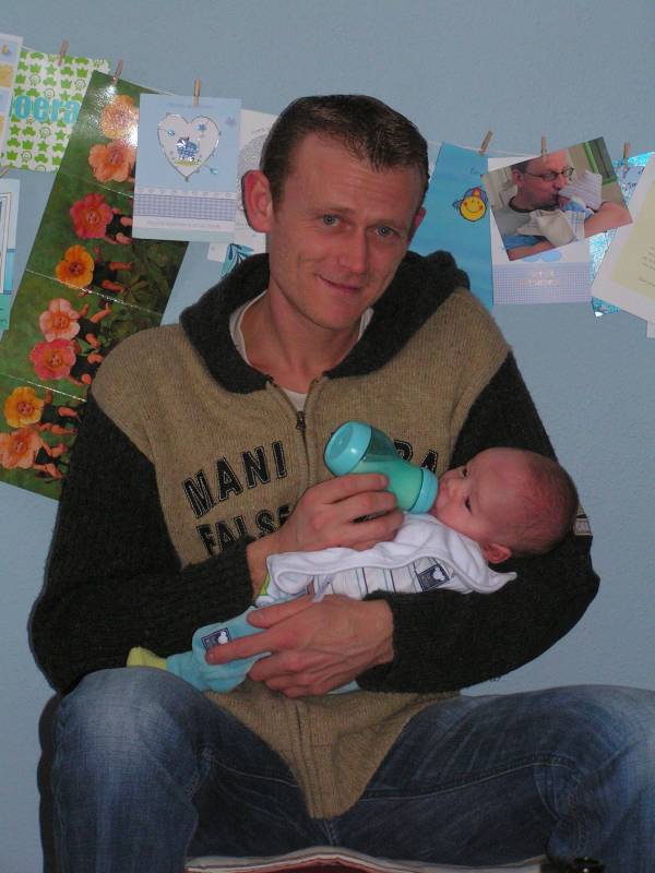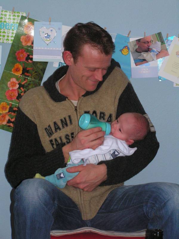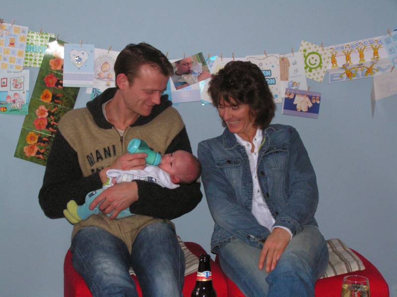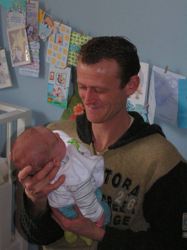 Afgelopen week is er niet veel gebeurd. Heerlijk lekker "bankhangen" en vooral veel genieten van onze kleine vent. Hij wordt steeds wijzer en stoerder en kijkt al veel meer om zich heen. Aardig bijdehand is hij ook al aan het worden. Want als hij boven huilt in zijn bed, en je zet de eerste voetstap op de trap, stopt hij met huilen, en eenmaal boven kijkt hij je aan met een big smile van "ik heb het weer voor elkaar" ... Dinsdagavond is Jese even bij ome Sander en tante Sil geweest. En vrijdagavond had ik eindelijk het rijk alleen met mijn JesseMan want mama ging de hele avond kaarten.. De hele avond het rijk alleen... Om 9 uur ging Jesse naar bed en werd om half elf weer wakker. Toen heb ik hem lekker naast me in bed genomen "even" tot moeders om 1 uur binnen kwam stoffelen..... Maar wel erg leuk !!!! Zaterdagmiddag kwamen ome Hans en tante Bernadette even langs, en kort daarna, hoe kan het ook anders, (andere) ome Hans, Tante Lau en Ria en Rosa. Die bleven lekker groentensoep eten. Ook kwamen Ome Ruud, tante Peet en Marscha even langs. Want vaders had de zender Ampere Radio weer even in de lucht gegooid, dus er moest weer muziek gedraaid worden. De volgende zondagochtend heerlijk uitgeslapen en ons mannetje mee op bed genomen. Als hij wakker is probeert hij zoveel mogelijk spieren te bewegen, want er is geen stukje van zijn goddelijke lichaampje dat stil ligt. Als hij dan wakker is schudt alles heen en weer, haha.. Hier kan je natuurlijk uren naar kijken, en dat doen we dan ook. Helaas voor Jesse moet papa dan toch weer dat apparaat met dat rare ronde ding voorop pakken... Juist, de foto (en film) camera, om een paar kiekjes te maken. Eenmaal uitgelegen kwamen oma en opa Vis langs, om Jesse weer even te knuffelen. Daarna ome Rein en tante Lies en het feest was weer compleet. Ome Rein en tante Lies bleven 's avonds nog genieten wat onze grote vrienden van shoarmatent Farao voor ons hadden "gekookt". Eenmaal uitgepeuzeld en uitgedronken keerden ook zij huiswaarts en deze papa ging even op bed liggen om half 8... Je voelt 'm al aankomen he :) Dat even liggen werd uiteindelijk om elf uur wakker worden om de hond uit te laten om vervolgens wakker te worden om zes uur om Jesse de fles te geven. Vandaag heb ik heeeeel veel vooral zware boodschappen gehaald, omdat ik morgen weer eens het ziekenhuis in moet om geopereerd te worden aan mijn oor. Betekend dus dat ik morgen mijn mannetje (en vrouwtje) een nacht moet missen..... Maar jah woensdag weer terug... Verder is Jesse vandaag even in de schuur komen kijken. Hij vond alle lampjes van de apparatuur erg interessant, dus over een jaar of twee staat vaders waarschijnlijk wel kabouter Plop te draaien :) Maar jah dat duurt nog even..........