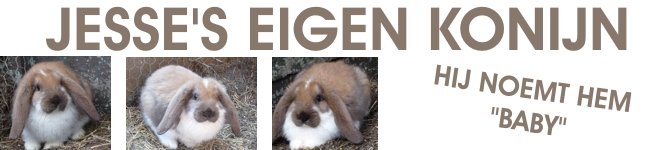 Via tante Astrid hebben we een Franse Hangoor kunnen bemachtigen. Dit lieve konijnte van een paar weken is voor Jesse. Toen we hem vroegen hoe hij het konijntje ging noemen zei hij "baby". Zo moet dit konijntje wat nu klein is, maar straks een reus, de rest van zijn leven door als baby... haha. Ze moet nog wel even wennen aan onze andere konijnen, maar nu gaat het erg goed en wordt ze af en toe zelfs gewassen door een van de anderen. Hier wat foto's van onze nieuwe aanwinst. FOTO'S