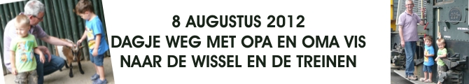 Op 8 augustus namen opa en oma Vis Jesse en Sem mee naar dierenpark de Wissel. Een leuk niet te groot park waar we een tijd geleden ook al eens zijn geweest. Die jongens vonden het natuurlijk prachtig. En als klap op de vuurpijl gingen ze daarna ook nog eens naar (stoom) treinen kijken ! Dat vonden de jongens, net zo treintjesgek als opa, natuurlijk helemaal tof! FOTO'S