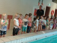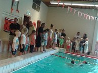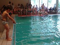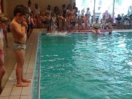 Snel aankleden en hup naar het zwembad... De supporters van Jesse vonden al snel een plekje aan de overkant van het zwembad waar de temperatuur behoorlijk tropisch was.. De altijd vrolijke zwemleraar verwelkomt iedereen en het afzwemmen kan beginnen... Gelukkig had de zwemleraar zijn lolzwembroek aan en maakte leuke grapjes zodat de kids vrij ontspannen te water gingen... Jesse en zijn grote vriend Moos (zitten bij elkaar in de klas) gingen nog net niet arm in arm te water.. Eerst met kleren aan op hun buik en rug.