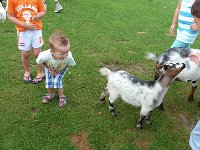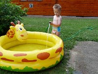 De volgende dag kon je op de kinderboerderij de dieren eten geven. Dat vonden de kids wel superleuk net als de mega speeltuin die ernaast lag. Daar moest natuurlijk ook gespeeld worden. Omdat het best warm was ben ik er met Jesse en Sem op uit getrokken om een opblaasbaar zwembadje te kopen. Dit was gelukt bij het Kruidvat en Milan was een zwembadje met giraffe die water uit zijn mond sproeide rijker. Nou was dit erg klein en Jesse en Sem wilden natuurlijk ook, waarna Brenda een badje in het campingwinkeltje vond en een set badmintonrackets. Volop plezier dus voor het huisje. Na een dag lang sportief bezig geweest te zijn begonnen de magen te knorren en ging mama lekker spaghetti maken. Dat ging er natuurlijk wel in. Als toetje mochten ze een ijsje uitzoeken in de snackbar. Daar was vlakbij ook even later de kinderdisco zodat er nog even flink gedanst kon worden. Milan gooide zijn heupjes weer flink in de lucht ;) Toen dat was afgelopen ging Milan zijn bedje in waarna er niet veel later noodweer uitbrak. Flinke regen maar gelukkig konden we dankzij ons afdakje wel buiten blijven zitten. Door het getik op het dak viel ons jongste mannetje al snel in slaap.... Jesse vond het wel cool om naar de regen te kijken.