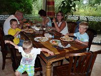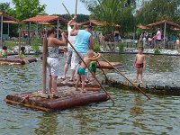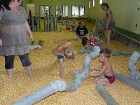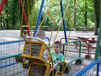 In de buurt was ook veel te doen en mij leek het bospark Klein Zwitserland wel erg leuk. Toevallig stonden er op Vakantieveilingen tickets voor dit park zodat we er lekker goedkoop heen konden. De tickets naar de receptie van het park gemailed die ze voor ons hadden uitgeprint.. Topservice! Na een half uurtje rijden stonden we in het park. Als eerste kleuterland aangedaan zodat Milan zich flink kon vermaken. Jesse en Sem in de schommel en van de langste buisglijbaan van Europa naar beneden gezoefd. Dat was cool! Vervolgens het zintuigenbos in. Hier werd je getest op evenwicht en concentratie. Allerlei spelletjes waarbij je je evenwicht moest bewaren. Zelfs mama waagde een poging, maar die bleef aan één kant hangen... hihi.. Vervolgens hebben we een eigen brug gemaakt over het water. Dat was er genoeg na die buien van gisteravond. Ook kon je er hutten maken enz. enz. Daarna bij een set waar je fossielen kon zoeken. Boven kon je met een pomp water uit de grond pompen om vervolgens stenen op te graven en te zeven met een zeef zodat je kon zien of er een fossiel in zat. Als er teveel modder op zat kon je het er voorzichtig met een borsteltje afhalen. Tegen twaalven begonnen de maagjes weer en hadden Jesse en Sem een groot stuk appeltaart, Milan en mama een pannenkoek en ik een panini naar binnen gewerkt op het terras.