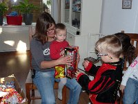 Na vele (lange) weken wachten en schoenen zetten was het dan eindelijk zover.... De verjaardag van Sinterklaas. Om half 1 kwamen ome Sander, tante Suus en Romano en Nadeche binnen en kon het feest beginnen. Lekker dansen en zingen op sinterklaasmuziek. Ondertussen druppelde iedereen binnen... Opa's en oma's, ooms en tantes... Uiteindelijk werd er rond half twee lang aangebeld en hard op het raam geklopt... Als een stel wilde apen renden de kids op de voordeur af om naar buiten te kijken hoeveel kado's er stonden... Want die stonden altijd voor de deur in een grote bolderkar. Maar wat een teleurstelling... er waren geen kado's.. Zelfs geen pepernoten gestrooid.. Alleen een stomme brief. Nou, wat moesten ze daar nou mee. Mama las de brief voor en wat bleek... Piet heeft ze in de schuur gezet.. Normaal duurt het minuten voor de jongens hun schoenen aan hebben, maar het kan wel snel ;) Dus snel de schuur in.. maar daar lag ook niets. De teleurstelling was van de gezichtjes af te lezen. Er was wel nog één mogelijkheid.. In papa's studio.. Dus ik maakte deze open en de hele studio stond VOL met kado's. Zoveel hadden ze ook niet verwacht ! Blije gezichtjes en terwijl de kado's werden binnen gebracht ging opa Vis de tweede brief voorlezen. Hierin stond dat de kids rustig moesten zijn en dat ome Ronny eeeeehhh Jonny het eerste kadootje mocht pakken. Deze was voor Romano !