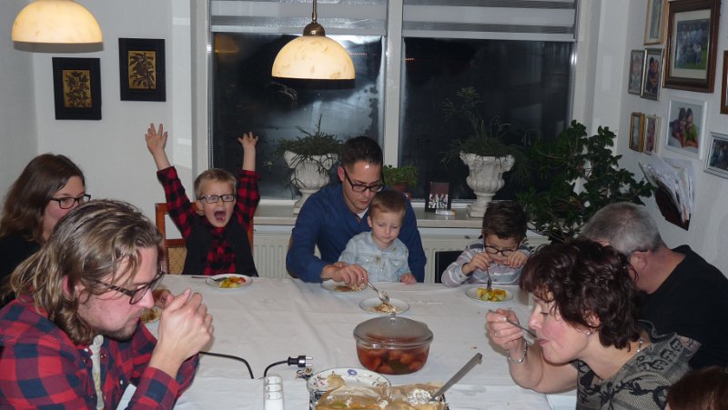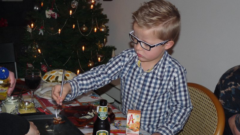 Na een heerlijk kerstontbijt gingen we 's middags naar opa en oma Vis om daar te gourmetten. Lekker eigen vleesjes bakken !!! Met een mannetje of 14 zorgden we ervoor dat het al aardig snel blauw stond en konden we elkaar amper nog zien... Aan het eind nog een heerlijk toetje gemaakt door tante Suus en ome Sander. Vervolgens met volle buik weer naar huis.