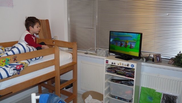 21 Januari was het zover. Onze oudste werd zeven jaar. Een echt grote jongen dus. Wat hem normaal niet lukt, lukte vandaag wel. Gelijk zijn bed uitkomen :) Hij mocht gelijk zijn kado uitpakken. Een televisie voor op zijn kamer. Natuurlijk was papa gelijk de klos en mocht hem gelijk aansluiten. Zo gebeurde het dat Jesse na een half uur vanaf zijn bed TV kon kijken. Helaas moest Jesse ook naar school, dus aankleden, eten en hopsa naar school. Eenmaal thuis natuurlijk gelijk chillen op bed...