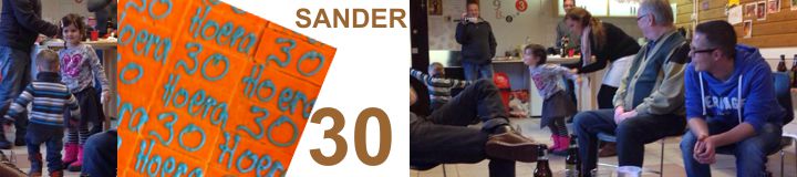 In de ochtend van 31 januari werd het speeltuingebouwtje aan de Jan Steenlaan versiert, voorzien van muziek en lekkernijen.. Boodschappen werden gedaan en de aanwezige kids konden niet wachten tot ome Sander zou komen. Verrast was hij zeker toen hij al toeterend met tante Suus het terrein op kwam rijden. Ome Sander werd nog even vol confetti geschoten en een medaille omgehangen met natuurlijk 30 erop... Het speeltuintje was natuurlijk een groot succes... De kids vermaakten zich prima terwijl de "volwassenen" zich tegoed deden aan een drankje en versnapering. 'S avonds stond een lekkere salade met stokbrood klaar. Toen het begon te schemeren kwamen de kids ook binnen en gingen lekker swingen op de muziek.