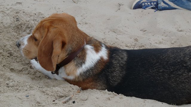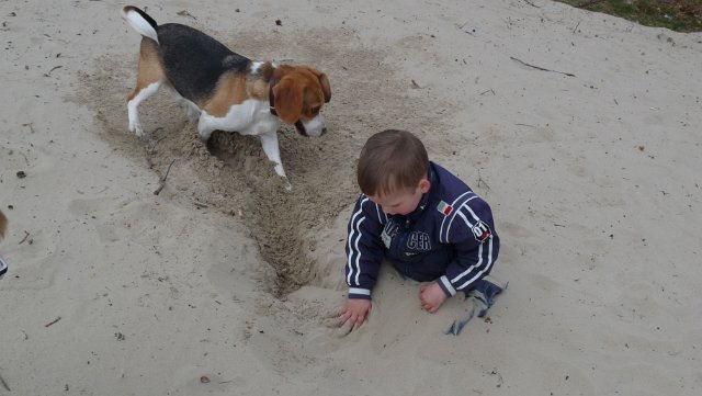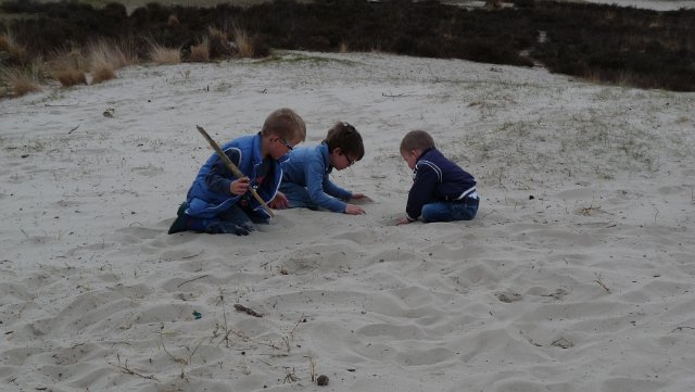 19 April, een mooie zonnige dag. Waar we normaal naar het bos zouden gaan, besloten we nu om naar de Soesterduinen te gaan. Eén grote zandbak dus gegarandeerd feest. Beaggy ging ook mee en die vond het geweldig in het zand. Die rende een paar flinke rondjes terwijl de kids lekker aan het rollen waren door het zand. Verderop zagen we een spoor, het leken wel grote voetstappen. Ik vertelde ze dat dat weleens de sporen konden zijn van de duinreus. Die zat overdag meestal verscholen in de bossen erachter... Dat was spannend, helaas liep het spoor veel te ver weg, dus af en toe tuurden ze de bossen in of ze hem zagen. Natuurlijk hadden we wat lekkers mee en gingen we ergens zitten om te picknicken. Daarna nog wandelen, in bomen klimmen enz. Door het zware lopen waren de kids, maar ook zeker Beaggy erg moe geworden. Gelukkig zit er aan het begin een tentje waar je wat kan eten en drinken. Eerst ging Beaggy zich al slobberend tegoed doen aan een bak water. De jongens een softijsje en wij een patatje. Toen de buikjes gevuldwaren nog even inhet bijbehorende speeltuintjeen daarna weer naar huis... Misschien dat we volgende keer wat vroeger moeten zodat we de duinreus zien ??